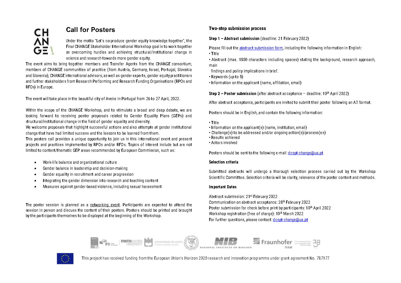 Within the scope of the CHANGE Workshop in Aveiro (26 to 27 April, 2022), and to stimulate a broad and deep debate, we are looking forward to receiving poster proposals related to Gender Equality Plans (GEPs) and structural/institutional change in the field of gender equality and diversity. We welcome proposals that highlight successful actions and also attempts at gender institutional change that have had limited [...]