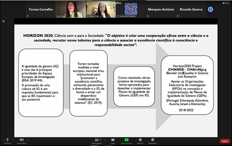 On March 8, Sara Diogo, from UAVR's Portuguese team, participated as an invited speaker in a Round Table discussion on International Women's Da. Her contribution focused on gender studies, inequality in Higher Education and the CHANGE project. The online event was organised by NELA - Núcleo de Estudantes de Línguas Aplicadas da Faculdade de Letras da Universidade do Porto. Around 20 people participated in the session.