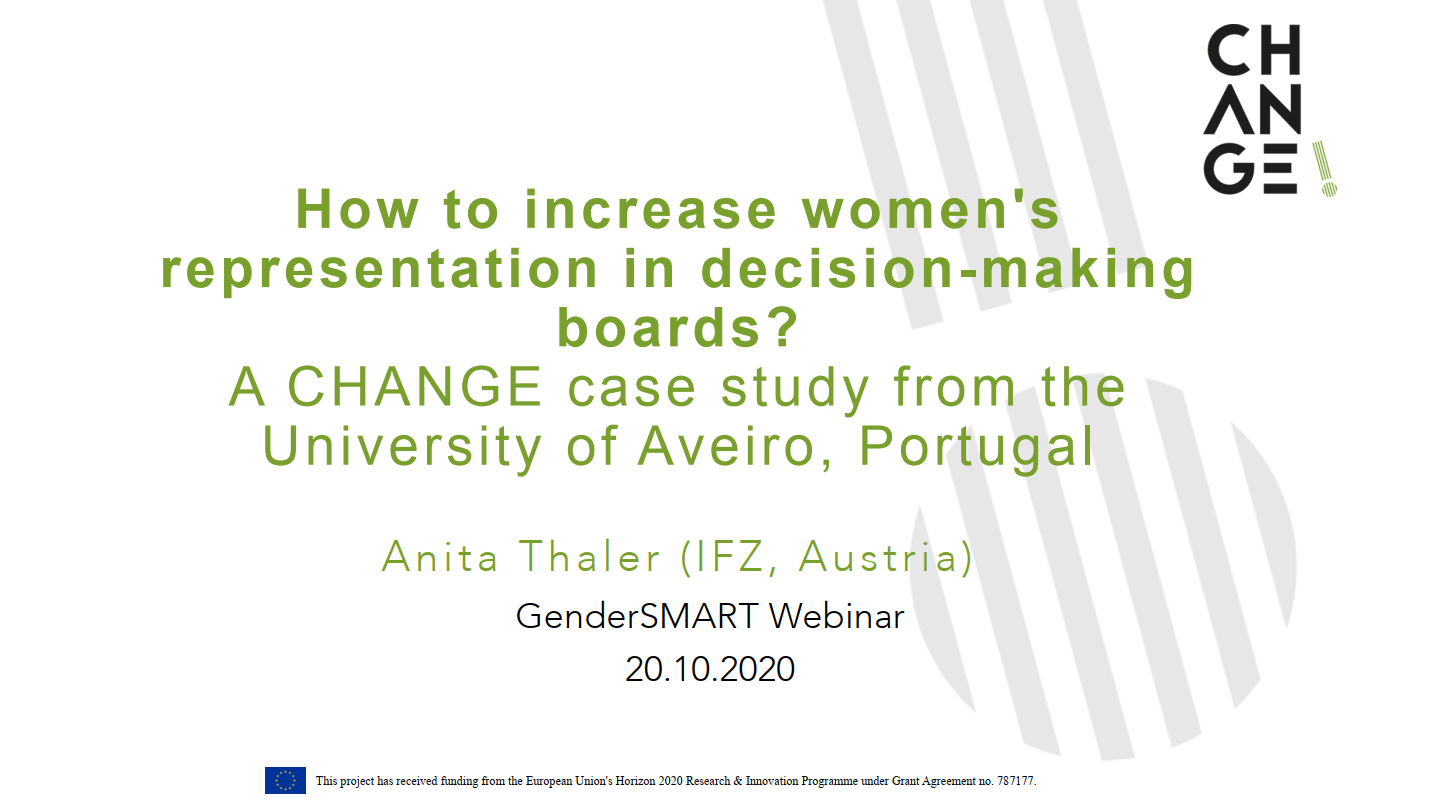 Focusing on this question, Anita Thaler (IFZ) presented insights from the CHANGE project and a case study from the University of Aveiro (provided by Teresa Carvalho and her team) at a webinar from sister project GenderSMART . On 20th October 2020 CHANGE and three other sister projects shared their experiences on "Taking action to improve women in leadership and....